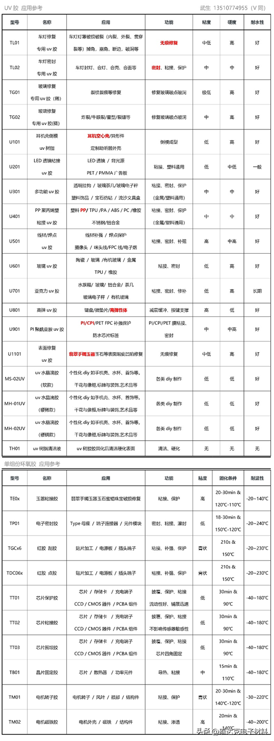 l 典型产品列出了各应用场景下常用的UV胶产品,为用户提供参考。