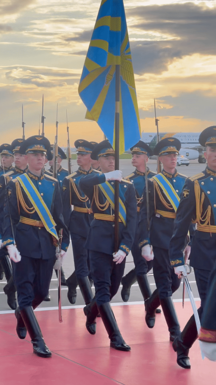 俄方在机场举行隆重迎接仪式。军乐团奏中俄两国国歌。习近平检阅仪仗队并观看分列式。