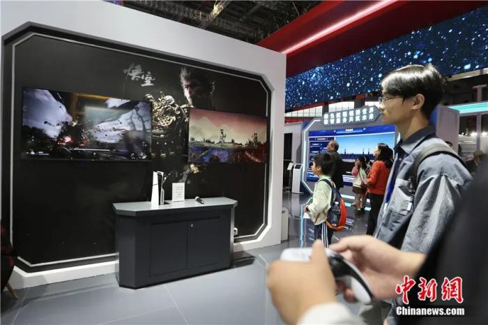 2024年11月5日至10日,第七届中国国际进口博览会在上海举办。图为11月9日观众在中国馆体验游戏《黑神话:悟空》。中新社记者 王紫儒 摄 同时,今天的年轻一代会在多元文化中寻找自我身份认同,改编自传统经典的动画、游戏作品更容易带给他们心理安全感,并且促进社会文化不断革新观念,以适应全球文化的迅速发展。