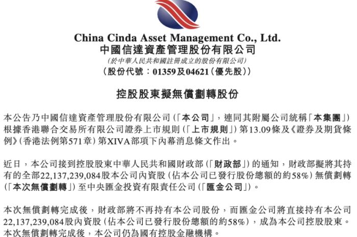近日,中国信达、中国东方资产、中国长城资产、中国农业再保险股份有限公司相继发布公告,控股股东财政部拟将其持有的股份无偿划转至中央汇金公司。