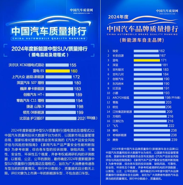 且在最新2024年度汽车品牌质量排行中,蓝电汽车在新能源自主品牌排名第三,其产品蓝电E5 也荣登中国汽车质量网2024年度新能源中型SUV(插混及增程)质量排行榜第二名,且连续3次获得中国汽车质量网质量排行第二名。如此品控品质,打破了低价=低质的魔咒吗,也是给用户的一剂“安心丸”。